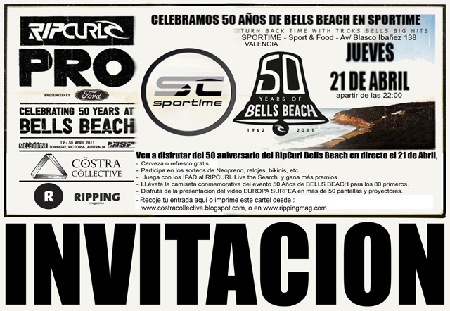 Rip Curl y Rippingmag os invitan el próximo jueves 21 de abril a la celebración del 50 aniversario del RipCurl Bells Beach que se organiza en Sportime, Avd/ Blasco Ibáñez 138, Valencia.